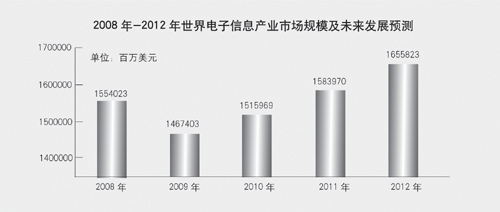 2010年,全球電子信息產(chǎn)業(yè)將逐步回暖并步入全面復(fù)蘇階段。根據(jù)《世界電子數(shù)據(jù)年鑒》預(yù)測(cè),未來(lái)3年,全球電子信息產(chǎn)業(yè)市場(chǎng)規(guī)模將維持3%-4%的增幅,預(yù)計(jì)2010年市場(chǎng)規(guī)模將達(dá)到15159.7億美元,2012年將達(dá)到16558.2億美元。同時(shí),未來(lái)3年信息技術(shù)應(yīng)用將進(jìn)一步深化,信息技術(shù)的廣泛滲透和深度應(yīng)用將催生出一批新的增長(zhǎng)點(diǎn);綠色I(xiàn)T將成為未來(lái)發(fā)展重點(diǎn),綠色信息技術(shù)在節(jié)能減排、低碳經(jīng)濟(jì)中將發(fā)揮重要作用;企業(yè)并購(gòu)重組步伐加快,新興市場(chǎng)拓展將成為電子信息產(chǎn)業(yè)發(fā)展的另一個(gè)重要引擎。