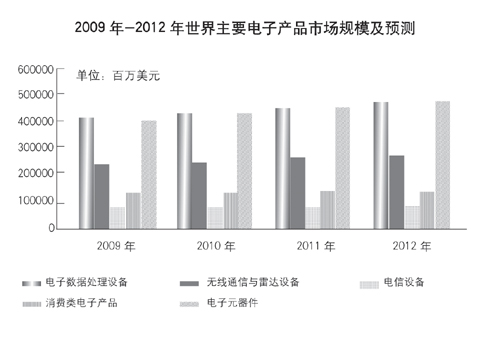 未來(lái)3年內(nèi),電子數(shù)據(jù)處理設(shè)備、電子元器件、無(wú)線通信產(chǎn)品和消費(fèi)類電子產(chǎn)品份額仍將占據(jù)世界電子產(chǎn)品份額的前4位。2009年上述4種電子產(chǎn)品所占比例分別是28.18%、27.99%、16.37%、9.20%。其中電子數(shù)據(jù)處理設(shè)備和消費(fèi)類電子產(chǎn)品所占份額分別比2008年提高了0.77%和0.33%。未來(lái)3年內(nèi),世界主要電子產(chǎn)品所占份額的比重基本保持穩(wěn)定,電子元器件所占比重略有增加,預(yù)計(jì)將由2009年的27.99%增加到2012年的28.89%,電子數(shù)據(jù)處理設(shè)備將由28.18%增加到28.43%。