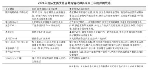 2009年,世界主要IT企業(yè)為應(yīng)對(duì)國(guó)際金融危機(jī),紛紛通過(guò)并購(gòu)戰(zhàn)略整合優(yōu)勢(shì)資源,開拓新興市場(chǎng),實(shí)施產(chǎn)品多元化發(fā)展,從而提升行業(yè)戰(zhàn)略地位和自身的競(jìng)爭(zhēng)力。未來(lái)3年這種發(fā)展態(tài)勢(shì)仍會(huì)繼續(xù)。