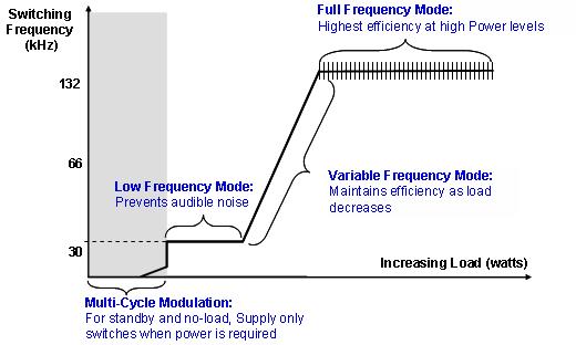 PI市場部資深經理李子俊強調了TOPSwitch-JX特有的多模式控制(MCM)算法,采用該技術可持續監測輸出功率,以確定最佳開關模式并改變MOSFET的工作頻率,從而提高整個負載范圍內的功率效率。該技術是內建在TOPSwitch-JX芯片內部的,無需電源工程師做特殊的設計。李子俊表示:“開關電源設計的主要訴求是在輕載的時候如何把電源本身功耗降低,在重載的時候如何把轉換效率提高。采用該特殊的技術,在空載和輕載時降低開關頻率,能極大的降低輕載及空載的功耗,對于能源之星要求的顯示器待機100mW,適配器空載100mW,以及PC電源待機0.5W的要求,均能充分滿足。比如針對一款顯示器的設計,在264VAC輸入時空載功耗為66mW,加上待機時負載功耗30mW,完全能滿足標準要求。此外,由于從輕載到重載開關頻率也在線性變化,從而保證了從輕載到重載的轉換效率平整。”