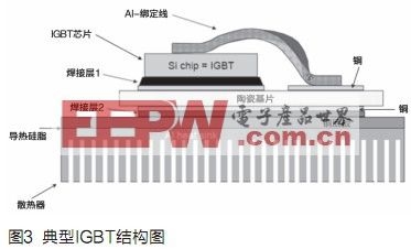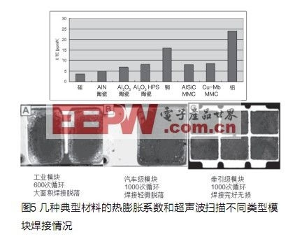 IGBT模塊由多層不同材料組成(見圖3),每種材料具有不同的CTE(熱膨脹系數),CTE的差別會影響功率模塊的使用壽命,當模塊使用時,溫度的變化會在不同層間產生機械應力而導致焊接脫落,我們的目標是選用熱膨脹系數差別盡可能小的材料來進行焊接組合。但另一方面,即使它們的熱膨脹系數十分匹配,因為材料本身的成本可能會太高,或者在生產過程中難以被加工或加工成本太高。例如列車牽引應用中的AlSiC基板。熱膨脹系數和襯底幾乎相同,因此有更好的熱循環特性。但對混合動力車應用因成本過高而很難被接受。