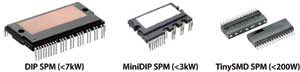 為了克服以上約束,最好采用智能功率模塊(intelligentpowermodule(IPM),也稱(chēng)為SmartPowerModule(SPM®))。圖2所示為一個(gè)典型的全封閉模塊,它包含一個(gè)完整的三相電壓源變頻器,以及相應(yīng)的柵極驅(qū)動(dòng)器和保護(hù)電路。采用這種模塊比分立元件方案節(jié)省電路板空間多達(dá)50%。尤其是這種模塊需要的外接部件極少,在設(shè)計(jì)上就考慮了EMC的要求。其峰值和平均EMC干擾強(qiáng)度比傳統(tǒng)設(shè)計(jì)低很多。