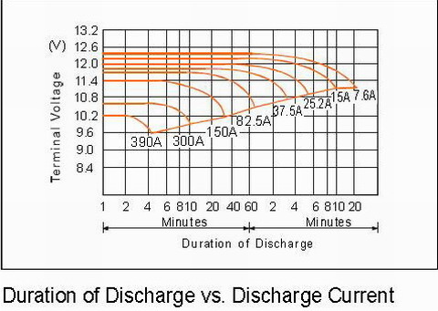 上圖是蓄電池生產(chǎn)廠家提供的150AH/12V蓄電池放電曲線。在實(shí)際使用時(shí)根據(jù)不同的負(fù)載電流選定不同的放電終止電壓。在該放電曲線中,以10小時(shí)放電和5小時(shí)放電曲線為例,對(duì)于10小時(shí)放電(負(fù)載電流為15A)來說,如果放電到終止電壓11V(44V),此時(shí)蓄電池放出的容量大約為100%。一般情況下,為了保護(hù)蓄電池盡量避免其深度放電,放電深度最好≤80%,終止電壓在46V左右,放電時(shí)間約為8小時(shí)。對(duì)于5小時(shí)的放電率來說(負(fù)載電流為25.2A),終止電壓10.8V(43.2V)放出100%容量,在實(shí)際使用時(shí)放電深度≤80%,終止電壓在45.6左右,放電時(shí)間為4小時(shí)。