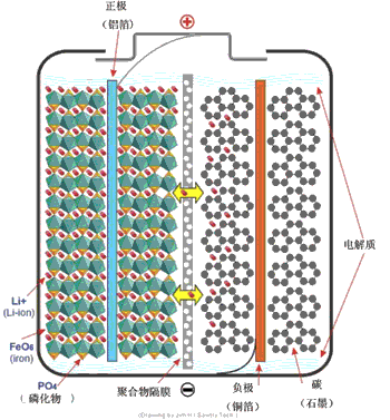 LiFePO4電池在充電時,正極中的鋰離子Li+通過聚合物隔膜向負(fù)極遷移;在放電過程中,負(fù)極中的鋰離子Li+通過隔膜向正極遷移。鋰離子電池就是因鋰離子在充放電時來回遷移而命名的。