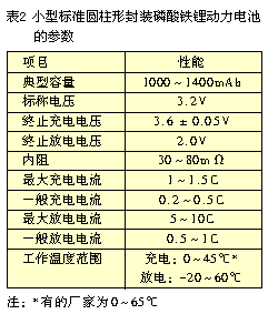 磷酸鐵鋰動力電池的容量有較大差別,可以分成三類:小型的零點(diǎn)幾到幾毫安時、中型的幾十毫安時、大型的幾百毫安時。不同類型電池的同類參數(shù)也有一些差異。這里再介紹一種目前應(yīng)用較廣的小型標(biāo)準(zhǔn)圓柱形封裝的磷酸鐵鋰動力電池的參數(shù)。其外廓尺寸:直徑為18mm、高650mm(型號為18650),其參數(shù)性能如表2所示。