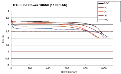 一種型號為STL18650的磷酸鐵鋰動力電池(容量為1100mAh)在不同的放電率時其放電特性如圖2所示。最小的放電率為0.5C,最大的放電率為10C,五種不同的放電率形成一組放電曲線。由圖2中可看出,不管哪一種放電率,其放電過程中電壓是很平坦的(即放電電壓平穩(wěn),基本保持不變),只有快到終止放電電壓時,曲線才向下彎曲(放電量達(dá)到800mAh以后才出現(xiàn)向下彎曲)。在0.5~10C的放電率范圍內(nèi),輸出電壓大部分在2.7~3.2V范圍內(nèi)變化。這說明該電池有很好的放電特性。