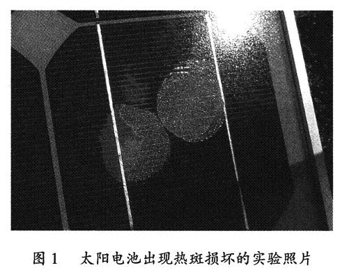 太陽電池熱斑是指太陽電池組件在陽光照射下,由于部分組件受到遮擋無法工作,使得被遮蓋的部分升溫遠遠大于未被遮蓋部分,致使溫度過高出現(xiàn)燒壞的暗斑,如圖1所示。熱斑可能導致整個電池組件損壞,造成損失。因此,需要研究造成熱斑的內在原因,從而減小熱斑形成的可能性。太陽電池熱斑的形成主要由兩個內在因素構成,分別與內阻和太陽電池自身暗電流大小有關。