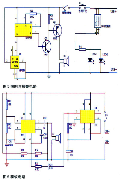 如圖5所示,當(dāng)按下預(yù)報(bào)警功能鍵時(shí),USB輸出電壓加載在報(bào)警系統(tǒng)上,此時(shí)移動(dòng)隨身電源處于"預(yù)報(bào)警"狀態(tài)。當(dāng)水銀開(kāi)關(guān)B1位置偏移正常的斷開(kāi)位置,將觸發(fā)繼電器工作,使KD9561音樂(lè)片工作,發(fā)出報(bào)警響聲,提醒注意安全。