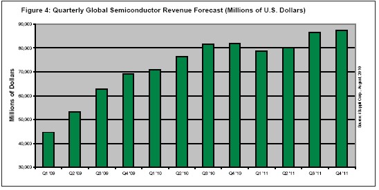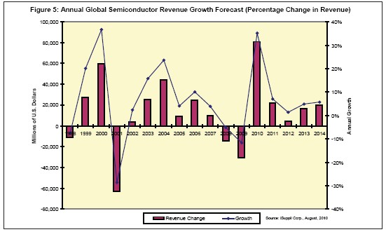 iSuppli公司預(yù)測,半導(dǎo)體產(chǎn)業(yè)將連續(xù)增長七個(gè)季度,然后在2011年第一季度出現(xiàn)季節(jié)性下降。 這將是該產(chǎn)業(yè)在1991至1995年期間連續(xù)增長19個(gè)季度之后,連續(xù)增長時(shí)間最長的一次。
