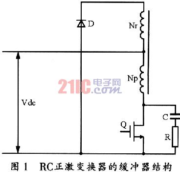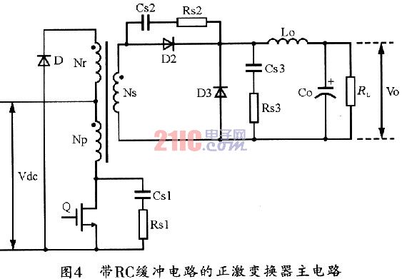 圖4所示是一個帶有RC緩沖電路的正激變換器主電路。該主電路參數為:Np=Nr=43匝。Ns=32匝,開關頻率f=70kHz,輸入電壓范圍為直流48~96V,輸出為直流12V和直流0.5A。
