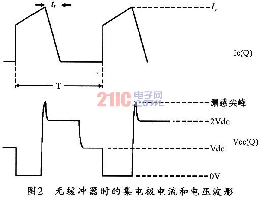 假設開關管沒帶緩沖電路,圖1所示的正激變換器的復位繞組和初級繞組匝數相同。這樣,當Q關斷瞬間,儲存在勵磁電感和漏感中的能量釋放,初級繞組兩端電壓極性反向,正激變換器的開關管集電極電壓迅速上升到2Vdc。同時,勵磁電流經二極管D流向復位繞組,最后減小到零,此時Q兩端電壓下降到Vdc。圖2所示是開關管集電極電流和電壓波形。可見,開關管不帶緩沖電路時,在Q關斷時,其兩端的漏感電壓尖峰很大,產生的關斷損耗也很大,嚴重時很可能會燒壞開關管,因此,必須給開關管加上緩沖電路。