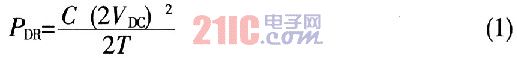 電容C的大小不僅影響集電極電壓的上升速度,而且決定了電阻R上的能量損耗。在Q關斷瞬間,C上的電壓為2Vdc,它儲存的能量為0.5C(2Vdc)2焦耳。如果該能量全部消耗在R上,則每周期內消耗在R上的能量為: