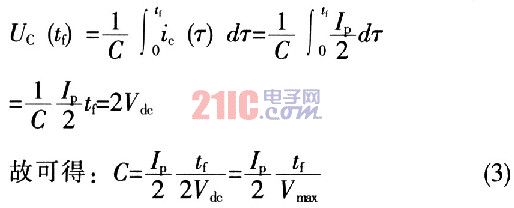 事實上,當Q開始關斷時,假設最初的峰值電流Ip的一半流過C,另一半仍然流過逐漸關斷的Q集電極,同時假設變壓器中的漏感保持總電流仍然為Ip。那么,通過選擇合適的電容C,以使開關管集電極電壓在時間tf內上升到2Vdc(其中tf為集電極電流從初始值下降到零的時間,可以從開關管數據手冊上查詢),則有: