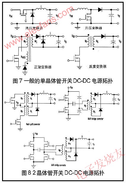 單晶體管拓撲(圖7),如降壓、升壓、正激、反激是在分布系統(高達100W)中設計用于相當低功率負載的dc-dc變換器。降壓和升壓電路是非隔離的,而正激和反激變換器提供變壓器隔離。