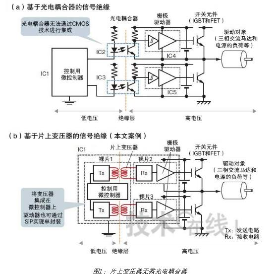 在絕緣型開關(guān)電源和交流馬達(dá)的驅(qū)動電路中,PWM信號等的絕緣一直使用光電耦合器(a)。如果能夠使用片上變壓器的話,就可以集成在微控制器上,因此可以大幅削減部件個(gè)數(shù)(b)。圖是根據(jù)瑞薩電子的資料制作而成的。