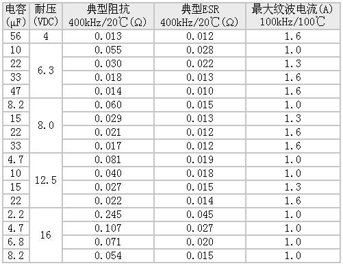 ESRD及ESRE兩個系列的電解電容具有極好的高頻特性,允許大的紋波電流,電容量允差±20%(精度為M級),等效串聯(lián)電阻ESR小,ESRD電容在100kHz時為10~45mΩ,ESRE電容在100kHz時低于10mΩ,400kHz、20℃時的阻抗為13mΩ到81mΩ,在使用溫度范圍內(nèi)阻抗幾乎不變,工作壽命長,小尺寸貼片式封裝,ESRD的尺寸為7.3mm(長)×4.3mm(寬)×1.8mm(高),而ESER系列的尺寸僅高度尺寸不同,高度為4.2mm,工作溫度為-55℃~+105℃。