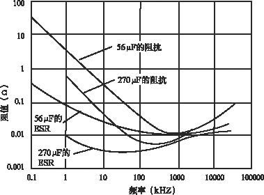 這兩個系列電容器的典型特性曲線如圖3、圖4及圖5所示。圖3是56μF(ESRD系列)及270μF(ESRE系列)在不同頻率時的阻抗值及ESR值。在100kHz~1MHz時,其阻抗及ESR值都很小,并且可以看出即使是56μF的電容量,在1MHz時,其ESR值與270μF的值相差并不多。