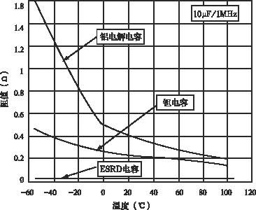 圖4是三種不同的10μF電容器在溫度變化時的阻抗變化情況,可以從圖4中看出鋁電解電容器在負溫時阻抗變化較大,鉭電容性能較好,而ESRD電容在-55℃~+105℃的溫度范圍內(nèi)阻抗幾乎不變,而且三種電容中ESRD型電容器的阻抗最小。