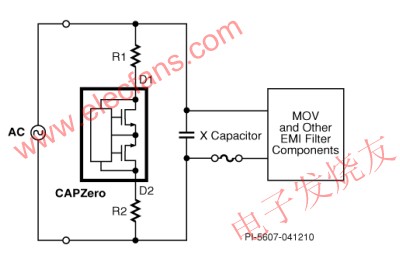 每款CAPZero器件均采用集成AC損耗檢測器和背靠背MOSFET的SO-8封裝。當(dāng)存在AC輸入電壓時,CAPZero保持關(guān)閉狀態(tài),阻擋電流進(jìn)入放電通路,消除功率損耗。AC電壓消失后,CAPZero開啟,接通電阻,允許輸入濾波電容放電。CAPZero通過AC線路自行供電,在230VAC輸入時功耗低于5mW。
