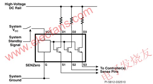 在消除市電輸入的電流消耗之后,接下來需要消除電路中的那些即使在待機(jī)狀態(tài)下也會連續(xù)消耗功率的其他元件的電流消耗。在較高功率應(yīng)用中,在高壓母線與功率因數(shù)校正(PFC)和DC/DC轉(zhuǎn)換器的電源控制器之間可能存在多條信號通路。例如包括PFC系統(tǒng)中連接升壓控制器的前饋或反饋信號通路,以及雙開關(guān)正向/LLC/半橋和全橋轉(zhuǎn)換器中的前饋信號通路。PI的第二款新產(chǎn)品是SENZero,它可以在不需要這些信號通路時將它們隔離,從而消除不必要的功率損耗。SENZero的典型應(yīng)用如圖4所示。