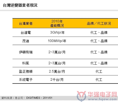 展望2011年,臺(tái)廠可獲得的代工單可能下滑,但長遠(yuǎn)來說,因太陽能逆變器價(jià)格會(huì)持續(xù)走跌,當(dāng)毛利率持續(xù)下滑,國際大廠為求經(jīng)濟(jì)效益,便會(huì)開始大量委外代工,以求降低成本,且委外代工后可更專注于提升售后服務(wù)及行銷推廣。