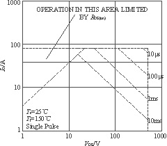 檢測電纜絕緣中,通常需要的直流電壓為50V,這樣,設(shè)定中性點的接地電阻最小值為5Ω,通過歐姆定律我們可以得出,直流電源至少要能夠提供10A的電流;此外,考慮到在測量過程中需要的開關(guān)速度,就可以選擇合適的電力電子器件了。經(jīng)過對常用全控型電力電子器件的考察,我們決定采用MOSFET來作為開關(guān)器件,選用IR公司的IRFP460。IRFP460是IR公司生產(chǎn)的高速器件,它的安全工作區(qū)如圖2所示,在圖2中我們可以看出,在50V的情況下,10A是它可以安全關(guān)斷的電流[3]。