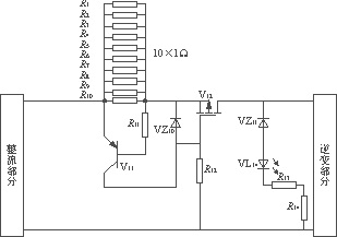 在圖8中,R1—R10為1Ω的標(biāo)準(zhǔn)電阻,功率為2W,當(dāng)電流超過預(yù)定值時,在并聯(lián)電阻上的壓降超過0.7V,三極管導(dǎo)通,此時,MOSFET將因柵源極間承受反向電壓而截止,從而切斷主電路;當(dāng)電流值正常時,MOSFET正常導(dǎo)通,不會影響電路的正常工作。這種電路的缺點在于,如果電路中出現(xiàn)時斷時續(xù)的過電流時,MOSFET將會不斷地動作。為此,在圖3中還加入了其他保護元器件。