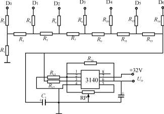 這需要將計數器的二進制數轉化為電壓。顯然用D/A轉換是可以的,但電路復雜程度上升,成本也有所提高。故為了簡化電路我們僅借用D/A轉換網絡的思想,利用權電阻T形網絡將4516的7位數值變換成模擬量輸出,推動電壓表指示,見圖5。