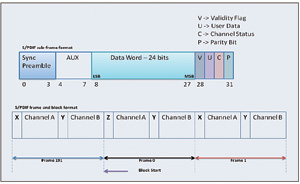 S/PDIF幀格式——首先驅動數據的最低有效位。每個幀有兩個子幀,分別是32個時隙,共64個時隙(見圖2)。子幀以一個前導碼開始,后面跟隨24位數據,最后以攜帶用戶數據和通道狀態等信息的4位結束。子幀的前4個時隙稱為前導碼,用于指示子幀和塊的開始。前導碼有三個,每一前導碼均包含一個或兩個持續時間為3UI的脈沖,從而打破雙相編碼規則。這意味著,該模式不可能存在于數據流中的其他地方。每個子幀都以4位前導碼開始。塊的開始用前導碼“Z”和子幀通道的開始“A”表示。前導碼“X”表示通道“A”子幀的開始(不同于塊的開始),前導碼“Y”表示通道“B”子幀的開始。