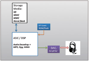 便攜式音頻系統——有些手持式音頻系統采用ASIC,有些則采用DSP。MP3、Ogg和其他媒體文件等音頻內容通常存儲在高密度存儲設備中,如NAND閃存、安全數字(SD)卡、多媒體卡(MMC)和安全數字高容量卡(SDHC)等。
