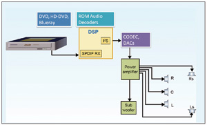 AVR/家庭影院系統——家庭影院音樂系統通常是多聲道音頻系統(見圖6)。Dolby5.1和DTS5.1是主流多聲道音頻系統。DVD播放器通過光纖或同軸電纜S/PDIF接口發送編碼音頻數據流。系統利用S/PDIF接收器芯片解碼雙相標記編碼數據,并提供與處理器相連的串行幀接口。S/PDIF接收芯片通常向處理器提供I2S格式的數據流。某些處理器片內集成S/PDIF接收器,無須使用外部接收器芯片。處理器運行自動檢測算法來確定數據流類型,如Dolby、DTS或非編碼PCM音頻流等。