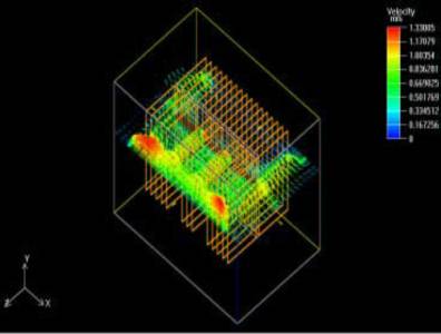 盡管散熱器的參數(shù)優(yōu)化對(duì)溫升控制略有改善,但仍不能滿足功率管的可靠性要求,因此,我們考慮強(qiáng)迫風(fēng)冷的散熱方式。在上述計(jì)算模型的基礎(chǔ)上,我們?cè)诖怪狈较蛟O(shè)定流體的流速為1.5m/s , 即在散熱器底部送風(fēng),其他參數(shù)不變。我們注意到,此時(shí)系統(tǒng)給出的流態(tài)為紊流。在初始條件中作相應(yīng)的調(diào)整后,最終求得的器件表面最高溫度約為89°C。散熱器底板截面溫度圖及橫向風(fēng)速云圖分別見圖2、3。