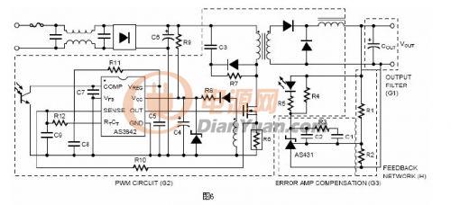 用經(jīng)典環(huán)路控制分析方法,開關(guān)調(diào)整器的控制環(huán)分為四個主要部分:輸出濾波器,PWM電路,誤差放大器補償和反饋。圖5用方塊圖舉例說明這四部分,圖6舉例說明一個開關(guān)電源電路圖。