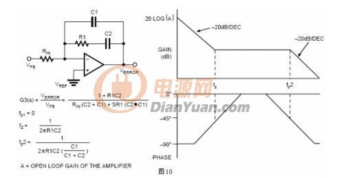 一旦輸出濾波器和PWM電路部分的傳輸函數(shù)確定下來,然后可以設(shè)定誤差放大器補償網(wǎng)絡(luò)以取得最優(yōu)化的系統(tǒng)性能。圖10例舉出一個在低頻時提供高的頻率滾降和高增益的補償方案。