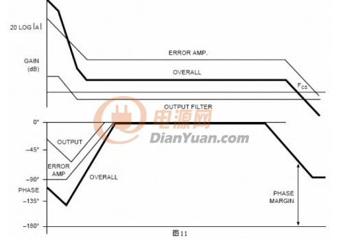 因為這是一個線性系統(tǒng),可以用疊加的方法得到整個系統(tǒng)的傳輸函數(shù)。通過把整個環(huán)路各部分的增益和相位疊加起來,產(chǎn)生整個系統(tǒng)的博得圖。通過放置補償網(wǎng)絡(luò)的極點和零點使系統(tǒng)的性能最優(yōu)化。圖11把各部分的博得圖結(jié)合起來,負反饋系統(tǒng)的180度相移也加入進來了。