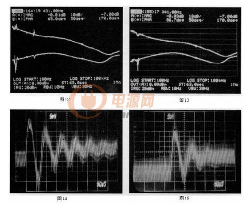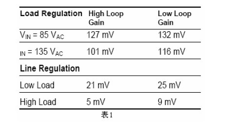 構(gòu)造一個150W的電流模式正激轉(zhuǎn)換器,經(jīng)過修正的小信號環(huán)路特性顯示出它在系統(tǒng)瞬態(tài)響應(yīng)時所起的作用。圖13(原文誤為圖12,譯注)給出它的增益-相位圖。與圖11所展示的一樣,獲得了相同的博得圖曲線。此增益相位圖顯示這個系統(tǒng)有86.7度的相位裕量。意味著穩(wěn)定的系統(tǒng)有快速的瞬態(tài)響應(yīng)。圖15(原文誤為圖13,譯注)給出系統(tǒng)的瞬態(tài)響應(yīng)。為了展示相位裕量的作用,通過增加整個系統(tǒng)的增益和提高穿越頻率,系統(tǒng)的相位裕量會減少。穿越頻率提高時系統(tǒng)的相位裕量在減少。圖12(原文誤為圖14,譯注)給出更高的穿越頻率和更少的相位裕量(65度)時的系統(tǒng)博得圖。其瞬態(tài)響應(yīng)見圖14(原文誤為圖15,譯注),注意更少的相位裕量導致更大的振蕩和更長的調(diào)節(jié)時間。表1比較了這兩個不同增益大小的系統(tǒng)之間線性和負載調(diào)節(jié)率的變化。正如前面所述,高的環(huán)路增益得到更緊密的線性和負載調(diào)節(jié)率。還應(yīng)該注意需在高的相位裕量和較低的環(huán)路增益之間取得平衡。