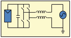 無變壓器的DC/AC逆變器在歐洲廣泛應(yīng)用,但是在美國,這種產(chǎn)品只是最近才在某些地區(qū)被使用。無變壓器的逆變器拓撲結(jié)構(gòu)有很多種,而Fraunhofer研究所開發(fā)的HERIC拓撲表現(xiàn)出了很高的效率。傳統(tǒng)的全橋逆變器的結(jié)構(gòu)如圖1所示,HERIC拓撲如圖2所示,此圖中還顯示了兩種新的開關(guān)/二極管對。這種拓撲利用獨有的續(xù)流路徑來減小開關(guān)和導(dǎo)通損耗,使效率提升到98%以上。