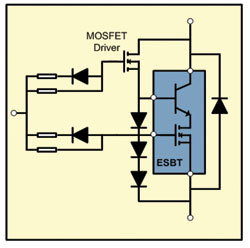 當一個ESBT同外置MOSFET和二極管/電阻配對的時候,整個電路看起來像一個3端器件,經(jīng)驅(qū)動后能達類似IGBT或功率MOSFET的工作狀態(tài)。ESBT的關(guān)斷能量比IGBT低很多,能實現(xiàn)高效設(shè)計,并非常適合高頻率、高壓逆變器設(shè)計。