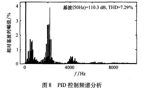 在高頻段,開環增益變得非常小,這對抑制高頻噪聲,提高系統穩定性和魯棒性是非常有幫助的。但是,在非諧波頻率處,沒有嵌入重復控制器的系統開環增益更大一些,這說明重復控制器對位于該頻率的信號控制效果較差。因此,PID控制器在系統中除了有提高系統動態響應速度的作用外,還要調節非諧波信號,彌補重復控制器的不足。