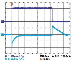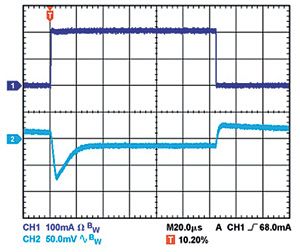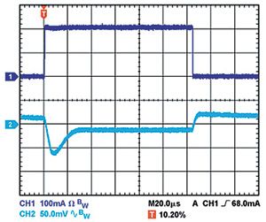 輸出電容還會(huì)影響調(diào)節(jié)器對(duì)負(fù)載電流變化的響應(yīng)。控制環(huán)路的大信號(hào)帶寬有限,因此輸出電容必須提供快速瞬變所需的大多數(shù)負(fù)載電流。當(dāng)負(fù)載電流以500mA/μs的速率從1mA變?yōu)?00mA時(shí),1μF電容無(wú)法提供足夠的電流,因而產(chǎn)生大約80mV的負(fù)載瞬態(tài),如圖1所示。當(dāng)電容增加到10μF時(shí),負(fù)載瞬態(tài)會(huì)降至約70mV,如圖2所示。當(dāng)輸出電容再次增加并達(dá)到20μF時(shí),調(diào)節(jié)器控制環(huán)路可進(jìn)行跟蹤,主動(dòng)降低負(fù)載瞬態(tài),如圖3所示。這些示例都采用線性調(diào)節(jié)器ADP151,其輸入和輸出電壓分別為5V和3.3V。