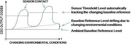 保持可靠性能。容性傳感器電極是采用PCB上的標準銅材料或柔性材料制成的。這種材料的特性會隨溫度和濕度的變化而發生改變。這種變化會使基線電平發生偏移(所有傳感器閾值電平均是以基線電平為參考的)。較大的基線偏移增加了接觸閾值電平過低或過高的風險(過低還是過高取決于基線偏移的方向)這會引起虛假的接觸誤差,或使閾值電平不是太靈敏就是不夠靈敏,導致接觸狀態的不穩定。為保持傳感器原始的信號接觸閾值檢測電平余量(靈敏度),CDC需要自動跟蹤基線偏移誤差的幅度,并對閾值設置進行相應的重新調整。圖2中的示例介紹了AD7147和AD7148的閾值電平如何針對因環境條件變化引起的基線失調變化進行自動跟蹤和調整。