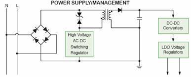 在這方面安森美半導(dǎo)體有豐富的器件可供使用,比如在AC-DC轉(zhuǎn)換應(yīng)用方面,有用于低功率離線電源的自供電高電壓?jiǎn)纹_關(guān)穩(wěn)壓器NCP1010-4、用于中等功率離線電源的單片開關(guān)穩(wěn)壓器NCP1027、高電壓門控振蕩器單片開關(guān)穩(wěn)壓器NCP1050-5;在DC-DC轉(zhuǎn)換應(yīng)用方面,有3A開關(guān)穩(wěn)壓器NCP3170和NCP3155、1.5開關(guān)穩(wěn)壓器或用作高達(dá)5A控制器的NCP3063/4、0.5A/1.0 A/3A開關(guān)穩(wěn)壓器LM2594/5/6、PWM控制器NCP3020/11和NCP1034;在LDO方面,有500mA LDO線性穩(wěn)壓器NCP5500、200mA輸出LDO線性穩(wěn)壓器NCP4588、50/150mA線性穩(wěn)壓器NCP4640/1、100mA LDO線性穩(wěn)壓器LP2951和80mA LDO線性穩(wěn)壓器NCP562。這些產(chǎn)品在應(yīng)用中的位置如圖1所示。這些電源方案具有高能效、低能耗及豐富的保護(hù)特性等特點(diǎn),非常適合智能電表應(yīng)用。