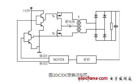 由于變壓器原邊電壓比較低,為了提高變壓器的利用率,降低成本,DC/DC變換如圖2所示,采用推挽式電路,原邊中心抽頭接蓄電池,兩端用開關管控制,交替工作,可以提高轉(zhuǎn)換效率。而推挽式電路用的開關器件少,雙端工作的變壓器的體積比較小,可提高占空比,增大輸出功率。