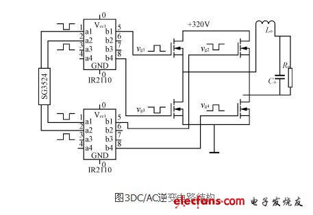 如圖3所示,DC/AC變換采用單相輸出,全橋逆變形式,為減小逆變電源的體積,降低成本,輸出使用工頻LC濾波。由4個IRF740構(gòu)成橋式逆變電路,IRF740最高耐壓400V,電流10A,功耗125W,利用半橋驅(qū)動器IR2110提供驅(qū)動信號,其輸入波形由SG3524提供,同理可調(diào)節(jié)該 SG3524的輸出驅(qū)動波形的D<50%,保證逆變的驅(qū)動方波有共同的死區(qū)時間。