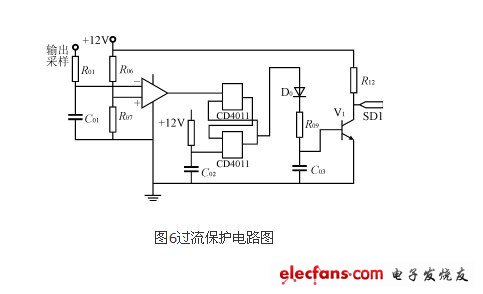 過流保護電路如圖6所示,它監(jiān)測輸出電流狀況,預設為1.5A。方波逆變器的輸出電流經(jīng)過采樣進入運算放大器的反向輸入端,當輸出電流大于1.5A后,運算放大器的輸出端跳轉(zhuǎn)為負,經(jīng)過 CD4011組成的R-S觸發(fā)器后,使三級管V1基級的信號為低電平,三級管截止,向IR2011的SD1端輸出高電平,達到保護的目的。