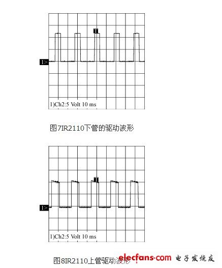調(diào)試過程遇到的一個較為重要的問題是關于IR2110的自舉電容的選擇。IR2110的上管驅(qū)動是采用外部自舉電容上電,這就使得驅(qū)動電源的路數(shù)大大減少,但同時也對VB和VC之間的自舉電容的選擇也有一定的要求。經(jīng)過試驗后,最終采用1μF的電解電容,可以有效地滿足自舉電壓的要求。