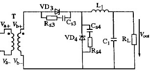 當主開關管VS 關斷時,勵磁電流流經磁復位電路。變壓器次級電壓反向,VS1 和VS3 關斷。VS2 的柵2源極寄生電容由流經VD 的電流充電。輸出電流由VS2 續流。在t2 時刻,磁復位結束,變壓器次級電壓為零。因為VD1 承受反壓截止,VS3 關斷,VS2 的柵極驅動電壓不變,因此即使變壓器次級電壓為零,VS2 保持導通續流。VS2 柵極驅動電壓一直保持到下一個開關周期開始,且VS3 導通之時。這就解決了死區時間內體二極管導通的問題。