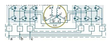 為了消除pwm電機驅動系統共模電流,a.consoli等學者基于共模電壓補償技術,提出了一種應用于由兩個或多個功率變換器組成的多驅動系統公共直流母線共模電流消除技術,拓撲結構見圖6所示。該方法是在兩個功率變換器做適當連接的基礎上,通過控制兩個變換器狀態序列而使共模電壓同步變化的新pwm調制策略。