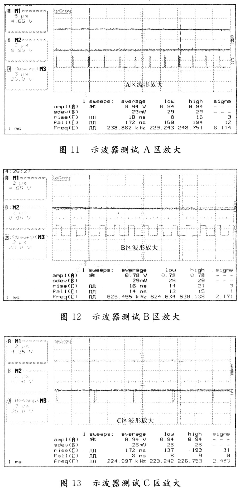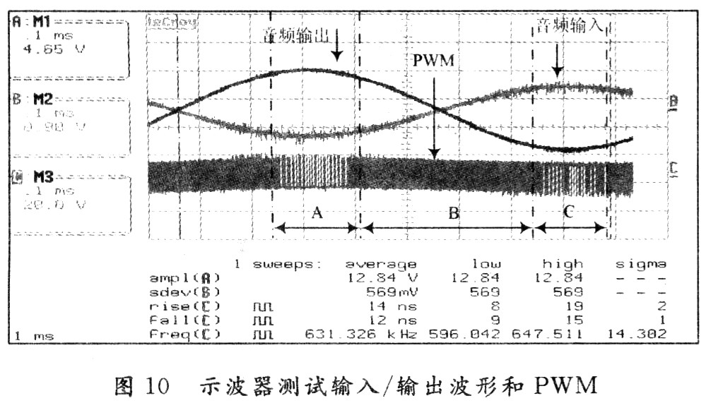 由圖10~圖13可知,輸入波形疊加有高頻雜波。說明前端引入不良干擾,需進一步分析改進;輸出波形平滑,無交越失真,Deadtime特性較好;輸入/輸出正弦波相位相反,直接由電阻RA128等形成閉環負反饋通路,降低了噪聲干擾,并進行增益控制。A,B,C區的拓展圖輸出正弦波峰、波谷、S區域處PWM的頻率分別為238.8 kHz,224.9 kHz,626.4 kHz,占空比不同,符合三角波采樣特性。圖中波峰、波谷處PWM脈沖fall下降沿和rise上升沿更為陡峭,相比S形區域,包含大量高頻諧波,易引起EMI輻射,但通過巴特沃思二階濾波器濾波后,輸出正弦波良好,無明顯高頻雜波迭加,EMC測試也無明顯對外輻射頻率,滿足了設計需要。