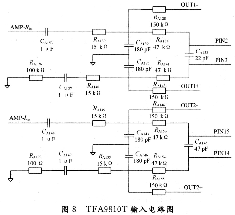 本設計取值1 μF,確定低端頻率為16 Hz,若該頻率定得太高,低端輸入電抗(如在20 Hz)會太大,可能導致輸出端較大噪聲和直流偏移噪聲(plop-noise)。反饋信號與經過緩沖的輸入音頻比較后,通過RA133進入TFA9810T進行PWM調制。為避免圖8中Rin/Lin輸入信號頻率因半導體非線性產生和頻和差頻,導致輸出端出現嘯叫聲,則通過調整電容CA123/CA145,將兩路載波頻率調差50 kHz左右。本設計中將取CA123=22 pF,CA145=47 pF,實現了Rin/Lin載頻相差50 kHz。